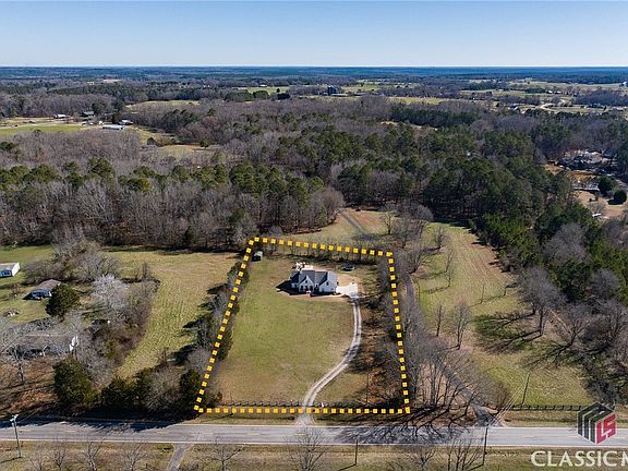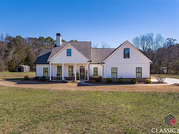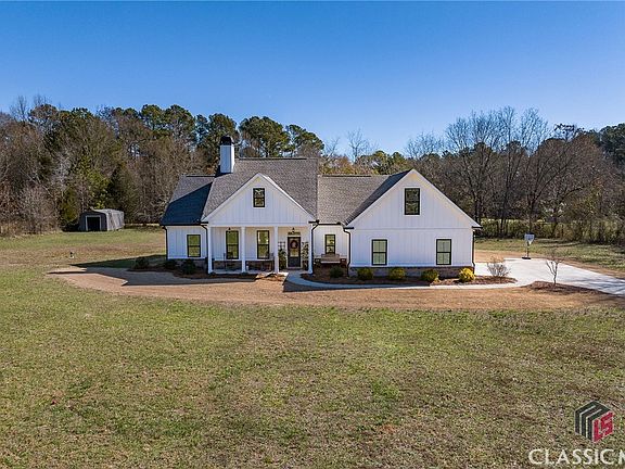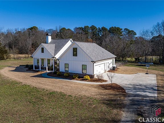 This beautiful modern farmhouse is tucked away on almost 2 private acres with a gated driveway, fenced yard and was built for a family member by one of Oconee County's most reputable builders, Greg Conley Construction. It is conveniently located in a rural setting close to both downtown Watkinsville and downtown Madison. The open concept plan features a kitchen with large center island, custom cabinets and tile backsplash and the dining area will easily accommodate a large farm table for holiday gatherings. The vaulted great room is open with fireplace, built in cabinets and windows that allow for lots of natural light. The split bedroom plan features 3 bedrooms and 2 and a half baths on the main level plus a finished bonus room with full bath upstairs that could easily function as a fourth bedroom or teen suite. The primary bedroom is on the main and has a large walk in closet and the primary bath has tile flooring and quartz counter tops. The large laundry room has a laundry sink and is equipped with shelves and hanging area. The oversized garage has a work area with work bench and there is also central vacuum system for the whole house. The rocking chair front porch and screened porch is a great place to relax and there is also a patio for grilling and outdoor fireplace in the back. The level lot is perfect for a garden and a water spigot is already in place and ready for spring planting. Don't miss this opportunity for this like new condition home built by one of the best! Fiber internet is available through Spectrum.