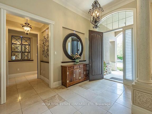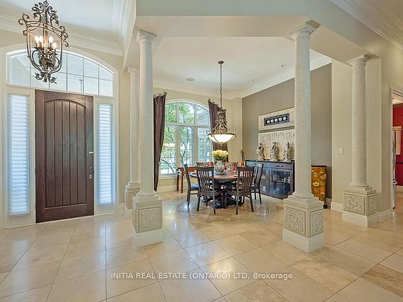 Stunning luxury executive on Shore Road w/high-end finishes provides 3995sqf (above grade)open concept design of 2 family rooms on main & upstairs, 5 bedrooms,5 baths ,12' ceiling foyer , Martini Bar with one Lime Stone Fireplace(totally 4 fireplaces) ,great room offers hardwood flooring ,coffered ceiling & Herringbone inlay, direct access to covered hot tub from master ensuite on main floor with 2 programmable shower heads, private dressing room walk-in closet, walk-in shower, & separate toilet room; heated-floor kitchen with Butlers Pantry, maple cabinetry, stone range hood echoes Viking gas stove, wall oven, the granite countertops and sub zero fridge. Backing onto trees, the sod-free back yard has covered stamped concrete patio, heated saltwater in-ground pool, hot tub & lounge area & outdoor fireplace!