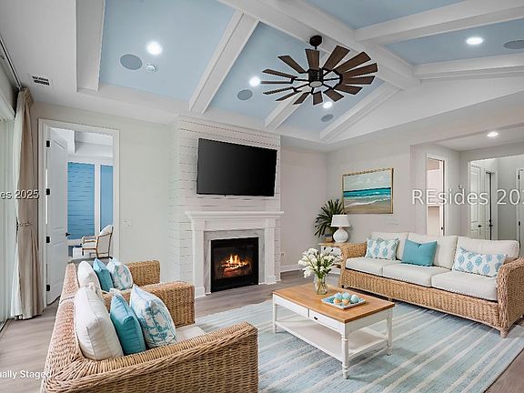 This magnificent view set back from the lagoon's edge with a bank of trees behind it will keep you mesmerized from the minute you see it. A beautiful home is included with the view. A clean, crisp, Coconut Model that is sunny and bright. Upgraded features: Built in Gas Fireplace, looming vaulted ceiling with Bead Board and Beams, Ship Lap walls and pale blue accents. The upgraded Quartz Countertops and backsplash accentuate the subtle coastal vibe. A large Island, spacious Dining Area with Bay Windows, and the soft colored LVP Flooring give it a quiet calmness. There is a separate Den with French Doors. The Primary Suite has not only a walk in shower but a wonderful soaking tub. The wall behind the bed is also a blue Ship Lap so bring on your crisp white bedding. Separate Guest Suite. Laundry Room. A huge Lanai is calling you to enjoy the outdoors so bring your grill and furniture and enjoy the wildlife...eagles, deer, turtles and more. A $6000 lighting package makes the front stand out from all the other houses.