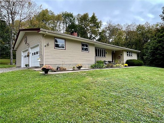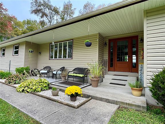 PRIVATE RANCH BUILT WITH QUALITY! This 4 bdrm/2.5 bath home is nestled on a 5.47 ACRE lot with a 300' driveway so it can barely be seen from the road. Perfectly convenient to the Village of Greene - only a mile into town! The homeowner has done the heavy lifting with 50 yr. metal roof and vinyl siding ('12), 5-zone BBHW furnace & oil tank, ('10), newly remodeled main bath & beautiful Therma-Tru insulated front door with sidelights. Huge open kitchen with updates to counter tops & cabinets('23), new appliances & farmhouse sink ('23). Custom bookshelves, window seat and stunning floor-to-ceiling fireplace in the living room. Full finished basement has spacious family room with large area for ping pong or pool table and a large bedroom with walk-in closet. Tons of storage space including 2 car oversized att. garage and separate pole barn with 2 rms for storage, hobby, woodworking- you name it! And let's not forget the well maintained and private land with 2 apple trees, 4 cultivated blueberry bushes, trails for ATV, fire pit area. You'll love the serenity and EASY ONE FLOOR LIVING!