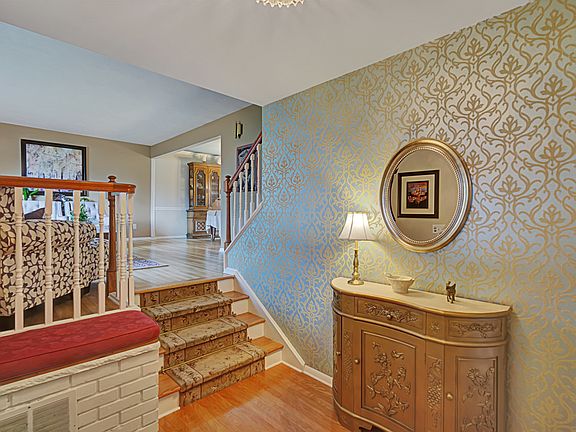 Pristine, light and bright, newly painted Colonial-Split with sweeping yard rimmed by mature flowering and fruit trees in sought after Bridgewater neighborhood! Open living room with pic window and dining room with sliders to deck make entertaining a breeze! Eat-in kitchen with newer stainless steel appliances, granite, maple cabinetry and sitting area overlooking the yard. Spacious family room with brick fireplace, bead boarding, pic window and access to oversized garage. Upstairs is a wonderful master bedroom with walk-in closet and ensuite stylish bath with pedestal sink and tiled shower, three additional bedrooms, and full bath with dual vanities and jetted tub. Lower level recreation room with casement windows to bring in natural light is ready to create whatever you need. Storage galore! Spacious paver patio with covered area and gas line BBQ. Hardwood floors, six panel doors, and stylish Roman shades, too! Just a dream home!
