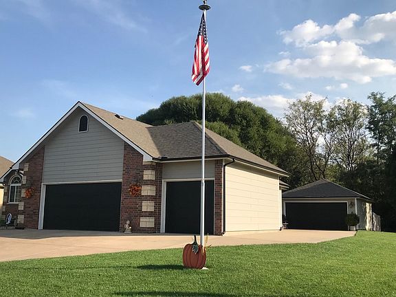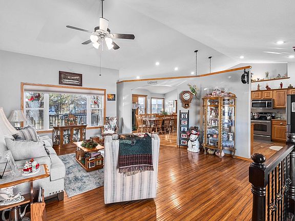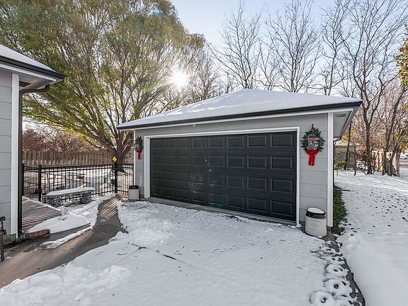 NO SPECIALS! This fantastic, well-maintained 4-bedroom home with 3 + 2 car garages (5) has great features and has had lots of upgrades. Sellers have upgraded the AC, furnace, and hot water heater, and finished an office in the basement adding cabinets and desk. The roof, gutters, and gutter guards are all new. They rebuilt to extend a new composite deck and added a concrete patio to the yard. In the 3-car garage, they added insulation, painted, epoxied the floor, and added cabinets. Hobbyists will love the additional detached 2-car garage. Nestled in a great neighborhood, this home has lots of light and nice views with the lake across the street and a gorgeous back yard. Wood floors and vaulted ceilings, large master bedroom with deck access, split bedroom plan, main floor laundry! Large basement family room with projector and storage, too! This one will go fast, schedule your showing today!