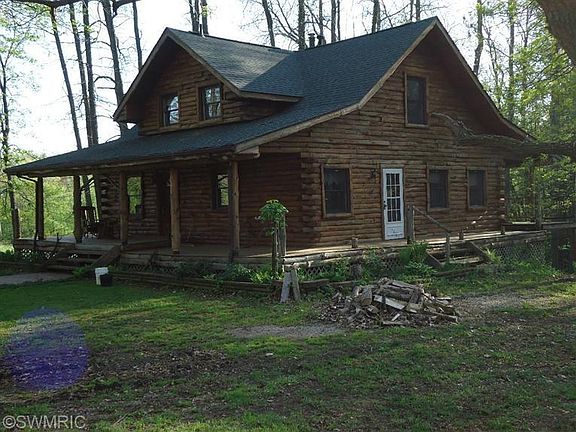 For details and more pictures, call listing Agent: Karen Gustafson at (269) 207-2441. Log home on 18 acres set up for Horses! Quaint wraparound porch enters into open floor plan with kitchen eating area and vaulted living room Main floor bedroom, bath and mudroom Master bedroom/bath upstairs with claw foot tub Walkout features a large bedroom, laundry room and storage 3 stall barn with tack room/fenced area Organic garden area (per seller) Peach, apple, cherry, plum trees Workshop with garage