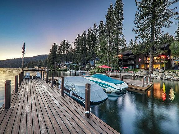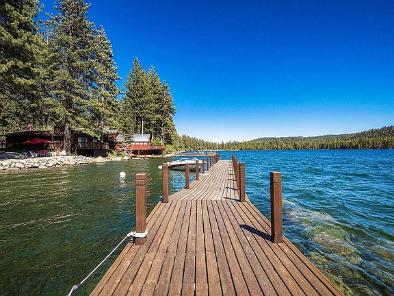 This beautiful residence is south facing for all day sun so you can comfortably relax on the patio, the lawn, the beach, or the dock. Take your pick of sun or shade, but either one is right at the water's edge and offers one hundred eighty degree views! The beautifully landscaped waterfront property offers lush greenery, towering trees, and unmatched High Sierra Beauty.