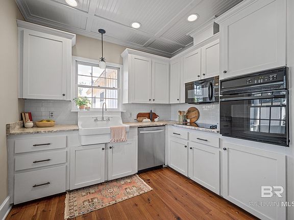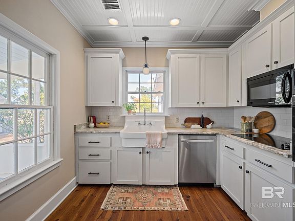 When entering through the front door of this MUST-SEE charming cottage you will instantly notice that this home has been very well maintained throughout the years. This Farmhouse features two bedrooms and two bathrooms. The primary ensuite entails a spacious bedroom and a large walk-in closet with built in drawers. Second bedroom has whitewash v-groove ceilings, two closets with the original doors and glass doorknobs. The bathroom also has its own closet, cast iron tub and lots of storage. You can't help but marvel at the Wide Plank pine floors that run throughout the home. Kitchen has granite counter tops, Farmhouse sink, and plenty of cabinets for storage. Window treatments include plantation shutters on most windows. Some of the unique features of this property include original v groove ceilings; new screen on screened in back porch and tankless gas hot water heater installed 4/23. Step outside and you will instantly feel at peace while sitting and relaxing in the large mature yard. There are four very large Satsuma trees, two lemon trees and one persimmon tree as well as a very large area for your garden. Outdoor storage abounds with a garden shed and metal shed. Located just 2 miles from a public boat launch on Fish River/Weeks Bay, directly between Fairhope and Foley and a short driving distance to Gulf Shores and Orange Beach. All information provided is deemed reliable but not guaranteed. Buyer/Buyers agent to verify all information. House is being SOLD AS IS WHERE IS. One of the Sellers is a Licensed Realtor in the State of Alabama.
