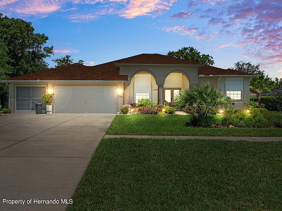 Immaculately maintained 4-Bedroom, 3-Bathroom Pool Home in the stunning community of The Oaks in the heart of Spring Hill. This gorgeous home welcomes you in with tons of curb appeal, landscaping, and an open front porch. Walk into the beautiful 11x7 foyer through double leaded glass doors, transom and built-in alcoves. The formal living room with double trayed ceiling, crown molding, plant shelves, and separate formal dining room is perfect for entertaining. Cook like a chef in the large kitchen showcasing Corian countertops, tons of cabinet space, pantry, stainless steel appliances, recessed lighting, 70/30 sink, ceramic tile backsplash, ceiling fan, and eat-in breakfast bar. Additional 11x10 breakfast nook with French door to rear lanai conveniently appointed off the kitchen. Giant 23x15 family room with triple sliders to the pool area, real oak flooring, and built-in shelving provides even more room for entertaining in this home. Retreat to the generous master suite of this home highlighted with sliding glass doors to the rear lanai, dual walk-in closets, and en-suite bathroom with dual sinks, snail shower, jetted tub, and stunning transoms letting in natural light. Guests can enjoy their own privacy with 3 ample guest bedrooms. Bedrooms 2 & 3 share their own guest bathroom with a large single vanity and tub/shower combo. Bedroom 4 can be closed off with ease using a single pocket door and has its own private guest/pool bath with tub/shower combo, linen closet, and large single vanity. Inside laundry room with laundry tub makes cleaning a breeze. Enjoy the true Florida lifestyle under the 27x9 covered rear lanai with its own outdoor kitchen. 45x27 screened pool cage houses the 30x14 diamond bright pool that is solar heated and overlooks the spacious backyard. Other features of this incredible home include 6 panel interior doors, 10 ft ceilings, updated lighting, updated fixtures, hurricane shutters, 3-car garage with screened in third car, water softener, central vac, pull downstairs, irrigation system & well, rounded corner beads, and dual electric panel. Located in the beautiful community of The Oaks and conveniently located near shopping, restaurants, and many local amenities. WHO DO YOU KNOW......that needs to book their private showing to make this their new home? Call us Today!