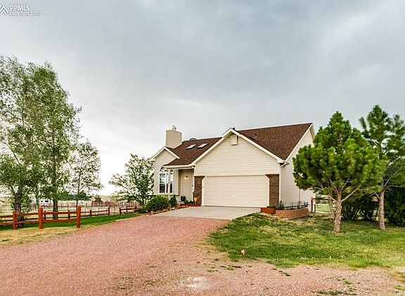 Welcome to a beautiful, well-maintained home that shows true pride of ownership located on 2.7 acres in the popular Trails subdivision. This hard to find 1 ?? story home with a main-level master bedroom & bath, plus finished basement. This home is ???move in ready!??? This location is minutes to shops & golf, 2 mins to Equestrian facilities, & 20 to Colo Springs! Zoned for horses! Enter into the home & step in into the living room with a high vaulted ceiling, beautiful stone fireplace, & oversize windows let in wonderful light. This great room also includes the dining area which opens to a large deck overlooking the property and the rolling terrain with southern views. The updated kitchen features solid slab quartz countertops, newer Samsung stainless appliances, new 42??? cabinets, granite stone sink, and desk area. There is also ?? bath for guests on this level. Enter into the main level living with updated bath, all with oil rubbed bronze fixtures and beautifully appointed. Upstairs are two nice sized bedrooms and full bath with nice overlook into the great room area. These rooms also have beautiful mountain and Pikes Peak views. The basement is a spacious recreational or family room area perfect for a media area or game room. The additional large 4th bedroom w/ 4th bath ensuite rounds off the basement finish. Outside is landscaped with rock retaining walls, new sidewalk, grass, flower beds and brand new sprinkler system. Fenced and cross fenced, the property features 10x30 nice, southerly facing loafing shed with tack room and paddock, plus a nice, multi use, closed in shed with dog set up and fencing. Other features include a finished garage, newer roof, stucco and steel exterior siding, newer paint & basement carpet. NEW A/C! Simply Gorgeous