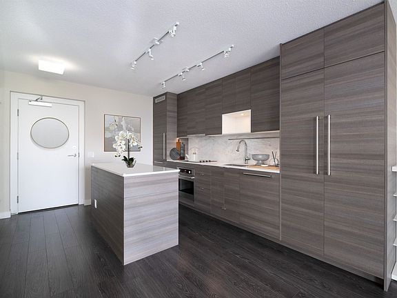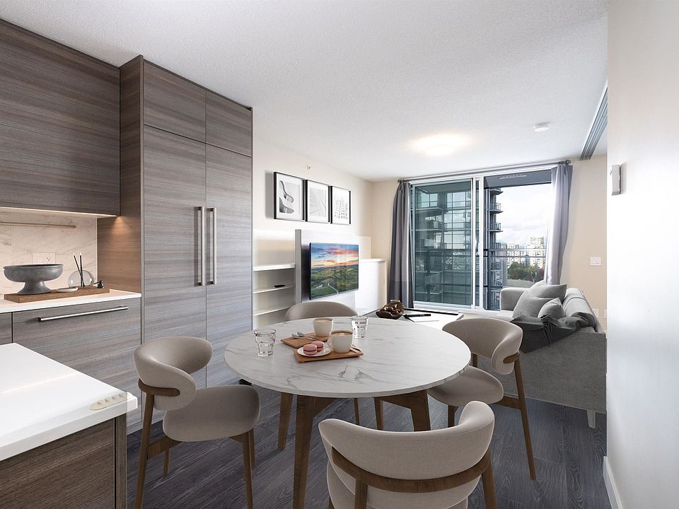 Details: University District - Alumni - by Bosa Properties Location Location Location! - North facing unit with mountain and city views - Easily convert Masterbedroom into living/working space with transformable love seat / fold-down bed. - Bosa Space integrated furniture system comes with movable TV panel with storage behind + fold-down bed in living room - Separates entertainment space from bedroom with sliding frosted glass wall. - Expandable dining table slides out of kitchen island and provides lots seating. 1 underground parking stall & locker included. Amenities includes: guest suite, lobby concierge service, lounge with theatre room, gym, boardroom, sky lounge with BBQ, and yoga pavilion.
