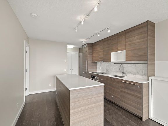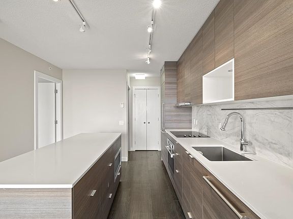 This uniquely designed suite has its own integrated furniture system that includes a floating TV panel with integrated storage & hidden day bed. Sliding frosted glass wall system in your living space easily converts to the second bedroom for guests when required. Love seat transforms into a Murphy bed to create this second bedroom. Excellent use of built in closet space for functionality and space saving. The Kitchen boasts European laminate cabinetry with soft-close doors, stone countertops & backsplash plus premium Euro Style Appliances. Large kitchen island that will extend to provide a dining table when required! In suite front loading Washer & Dryer, Den/flex space is perfect for a home office and also a balcony off the living area with spectacular views.