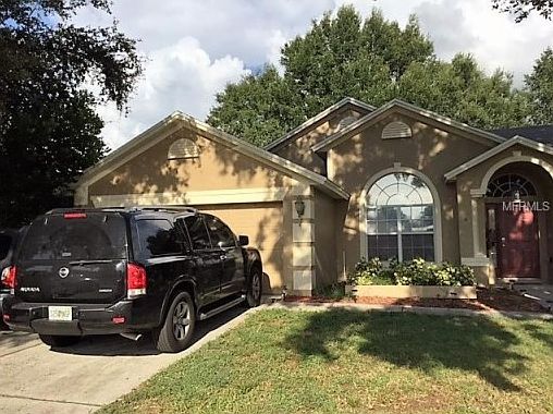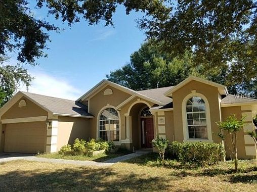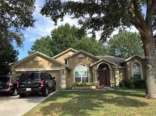 Price reduced! Near Disney World, around 15-20 minutes drive. Charming Ranch/ 1-story home nestled behind mature oak trees providing shade by cul-de-sac street in a quiet neighborhood. Split floor plan and vaulted ceilings give roomy feel to the home. Wood floors carry through great room, dining room, and owners bedroom areas. Sliding doors and windows open to back patio and private yard. Enjoy cost efficient gas utilities. Very pretty fa??ade.