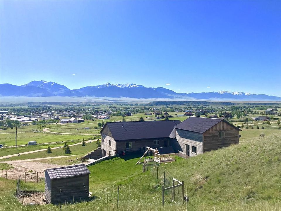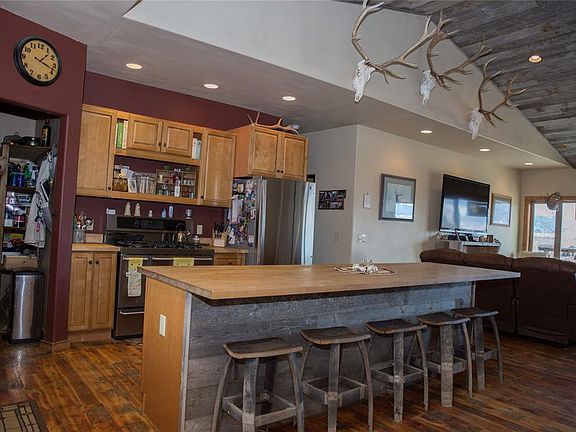 This custom 2015 home situated on 7.698 acres is only moments to town with breathtaking views of the Madison Range. Offering privacy and spacious living this home has many upgrades and custom woodwork throughout. Chef's kitchen has walk-in pantry and oversized, handmade, barn wood center island perfect for entertaining. Master bedroom features beautiful barn doors and oversized walk in closet with laundry pass-through, large walk in shower and double sink. Radiant heat in addition to a wood burning stove provides a warm, cozy atmosphere. Split plan, vaulted ceilings, partially fenced for pets. Spacious bonus room above garage. Winter entry. Large stamped concrete patio in addition to an oversized deck. Finished basement features stained concrete floors with large den, 2 bedrooms (egress window, non-conforming with no closets but possible addition), bath. 2 garages with one 2 car on main level and additional 2.5 car on lower level. This home could be split for live/rental opportunity.