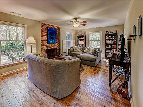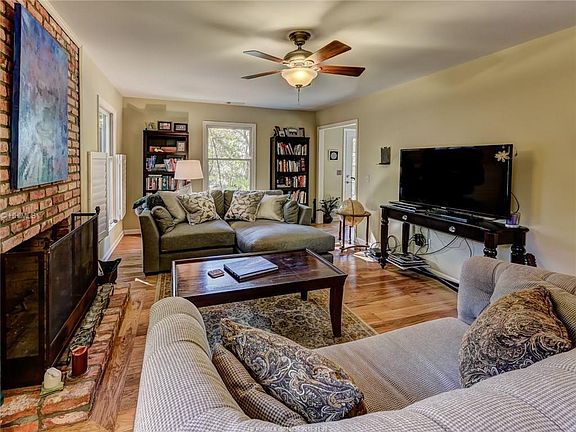 Privacy and convenience in Old Town, great view, launch your kayak and enjoy this unique home. Walk to festivals, Calhoun Street, and the Promenade. Coveted location on a large tranquil, secluded, wooded cul-de-sac with comfortable 3bed/2bath cedar siding home on Verdier Cove right off the May River. With a wood burning fireplace in living room, hand-scraped hickory hardwood floors, smooth ceilings, library or bedroom and bath down, 2 bedrooms 1 baths upstairs, dining area with greenhouse window wall, kitchen has white cabinets and stainless appliances, separate laundry room, and large deck.