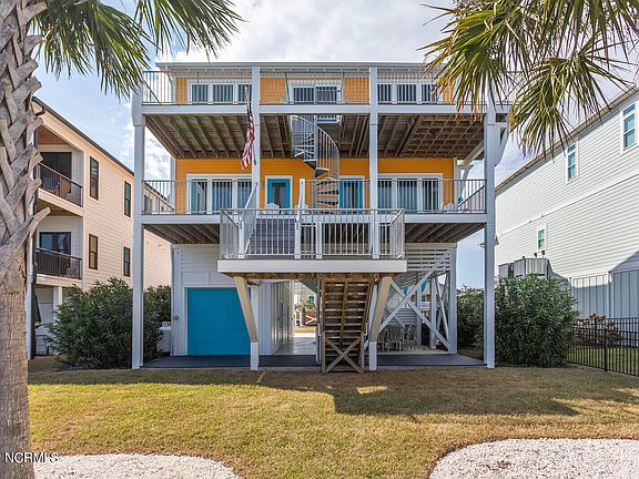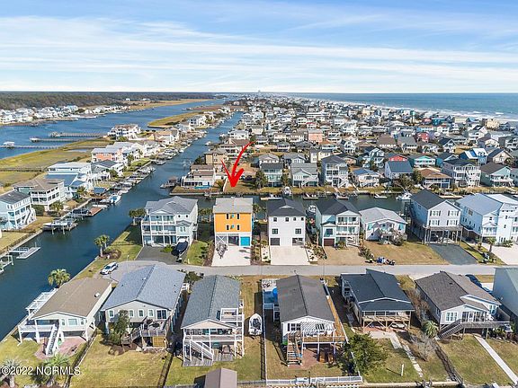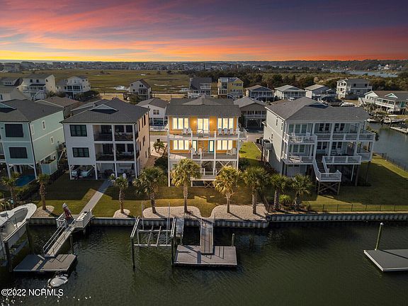 What is the prime focus in this stunning beach home? For some it will be the spectacular canal and ocean views. The chef's choice will most likely be the gourmet kitchen. And everyone will love the double-sided gas log fireplace strategically placed in the middle of the living area. You are invited to see for yourself as you ride the elevator to the top floor and observe the main living area where natural light streams through a wall of windows. The fireplace sits in the middle of this spacious room between the living and dining areas. The impressive kitchen boasts top of the line stainless steel appliances including a Frigidaire Professional refrigerator/freezer, Bosch gas stove, and 2 Bosch dishwashers. Guests can sit and converse with the chef at the large center island before moving to the extra-large dining table that easily seats up to 10 people under a unique rope pendant light. Sliding glass doors lead out onto an expansive deck overlooking the canal with ocean views as an added bonus. Two bedrooms on this floor share a large full bath and both offer canal and marsh views. The first level houses four bedrooms with multiple sleeping accommodations for large families. Two en suite bedrooms each open to a covered deck overlooking the canal with a spiral staircase that leads to the upper deck. Exterior features include a floating dock with boat lift, deck and patio areas, outside shower, and plenty of storage. This gem caters to both boaters and beachgoers alike and comes furnished with minor exclusions. Don't miss out!