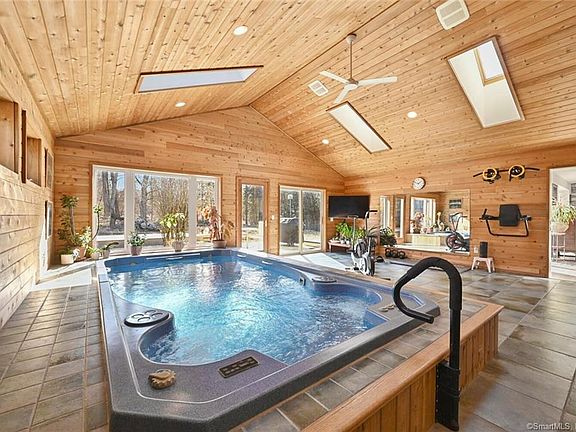 ONE OF A KIND! * Modern Ranch w/SWEEPING OPEN FLOOR PLAN *GEOTHERMAL HEAT* Separate building/original barn w/LOFT: TOTAL 26x40 (526sf for in-law/guest/home office PLUS 500sf storage w/loft). Wonderful peaceful setting HOUSE 1 is 3BR ranch w/RADIANT HEAT FLOORS; covered front entry to gracious welcoming foyer opens to LR w/built-in bookcases, vaulted ceiling w/exposed beams, track lighting, stunning flr to ceiling stacked stone fpl w/pellet stove. Dining area is surrounded by windows streaming sunlight! Eatin kit is anchored by large center island & features custom cabinetry, quartz counters & backsplash, 2 solar tube skylights & stainless steel appliances incl wall oven & separate in counter cooktop, microwave w/convection (dishwasher behind custom cabinet front). WOW the pool rm/solarium boasts indoor hydro-exercise pool, vaulted wood ceiling, skylights & sliders to deck w/full bath & sauna. Primary BR features sliders to a private deck & luxurious bath w/soaking tub, separate glass door shower, both w/safety grips, quartz vanity, designer tile & makeup center. 2 add'l BRs share Jack & Jill bath w/quartz vanity & glass door shower. Custom closets throughout. Laundry w/sink & builtins. LL workshop perfect for the hobbiest! Covered deck/breezeway to HOUSE 2/guest/in-law/office w/kitchen, full bath, luxury vinyl floors, 2nd laundry area. PRIVATE Level yard w/multi-tiered deck. Enjoy NEW Quarry Walk Ctr w/upscale vibe, restaurants, town green, grocery & boutique shops