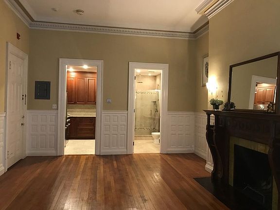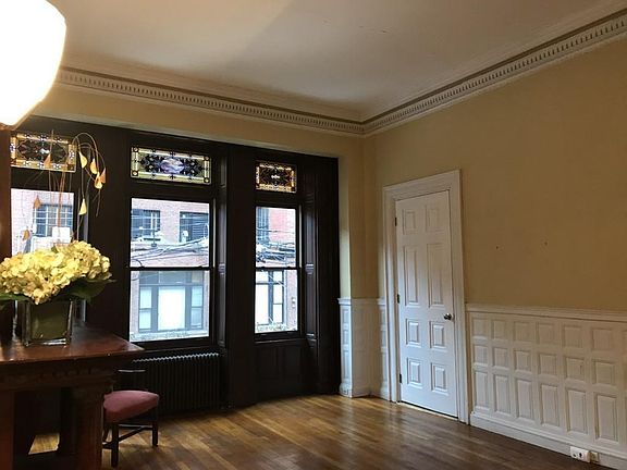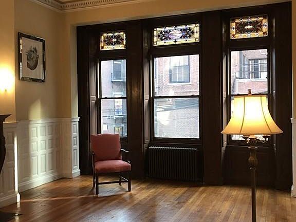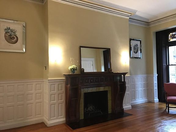 Quintessential brownstone on Comm Ave, combining beautiful old world detail with modern renovations. 12 feet ceilings adorned with ornate moldings & a ceiling medallion. South facing living room, graced with a stately mantled fireplace, 3 oversized windows with stained glass panels & plantation shutters. Off of the living room resides the bedroom with ceiling fan & walk-in closet-complete with built-in dresser & overhead storage. The efficiently designed kitchen has plenty of soft close cabinets & drawers, quartz counters, gas-cooking, Jenn-Air fridge, d/d, built-in wine rack, & coat closet. A luxurious bath offers a walk-in shower with quartz bench & quartz vanity. Easy access to the overhead storage is provided via the retracting ladder. Free laundry is located on the first floor. Professionally managed, elevator building.