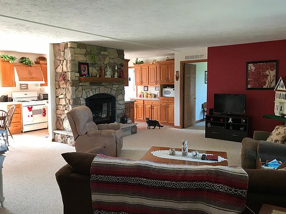 NOT your typical doublewide!This special home has so many upgrades! Offers 3 bedrooms, 2 baths, attached garage, gas fireplace with stone front. Sliders in the dining room lead to the deck to enjoy the many birds that visit this beautiful yard.Finished drywall throughout, Hardwood window sills,Two linen closets. Kitchen cabinets are maple hardwood, some with roll out shelves & cutting board. Extra deep soaking tub in the master bath. Lighted closets. Central Air.If you love the flower gardens in the summer, seeing the hills in the distance, then you've found the right home. Enjoy the blueberry bushes, raspberries and strawberries in the summer. Plus many perennials, flowering bushes and a lilac tree.