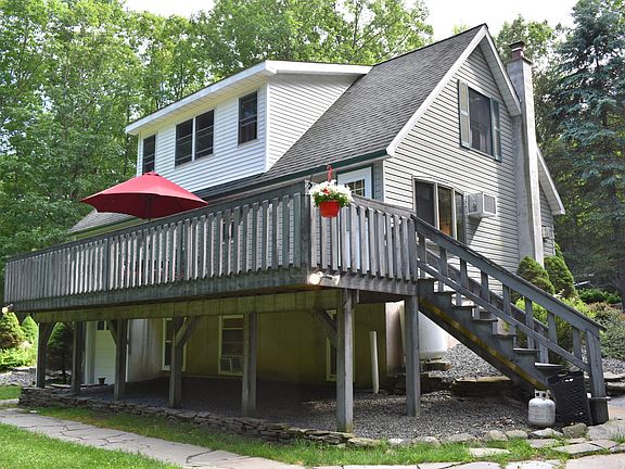 Mint condition, lovingly cared for Cape on 5 1/2 acres. Escape to the Lake Region of the Poconos to this 4/5 bedroom, three bath home, just minutes to Lake Wallenpaupack and the Quaint Village of Hawley. A wonderful year round home or perfect if you are looking for a weekend getaway this is the one! Features hardwood and ceramic tile floors, granite counters in kitchen and baths, propane free standing fireplace, garage, and paved circular driveway. Lower level ready for possible mother daughter or private suite.Professionally landscaped. Large back deck for entertaining or relaxing plus charming covered front porch. Life is short, enjoy it now!