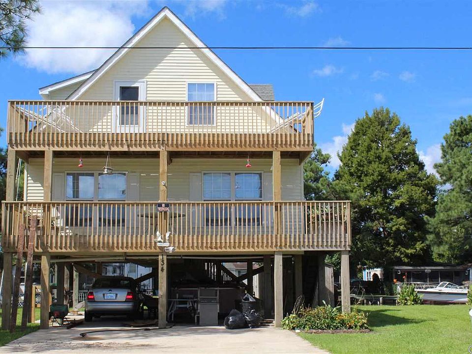 Nice semi-soundfront, canalfront home with vinyl siding. 2 levels of sundecks overlooking the sound. Beautiful sunrises! 60 feet of canal frontage. New carpet, 2 new storm doors, new roof. Shows very well! Storage building. Double driveway with plenty of room for parking. Deep carport, dry entry. Extra wide deck on main level. New carpet being installed. Nice deck off second bedroom upstairs. Tiled kitchen and baths. Main level has kitchen, dining area, large great room, full bath and bedroom. Second level has bedroom, full bath and large room that could be family or rec. room. Great second home or residence for this low price! Ready to move in!