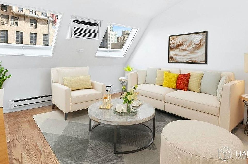 PLEASE ASK ME FOR A VIDEO TOUR! OK to pay lower rent for the duration of the lease after 2 months GRATIS. Move-in special for new tenants only. One and two year leases available. Top floor one bedroom triplex in fantastic Gramercy location. One bedroom with high ceilings, gleaming hardwood floors and four skylights! Renovated kitchen with quartz counter tops and stainless steel appliances including dishwasher. Spacious living room facing South. Open, loft like bedroom can hold a Queen size bed easily with large custom closet. Part time doorman building with laundry on every other floor, elevator and super on site. WE ARE ALSO TAKING RHINO AND THE GUARANTOR TEAM.