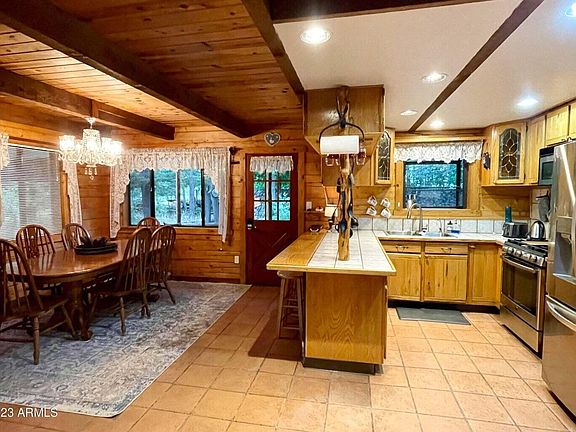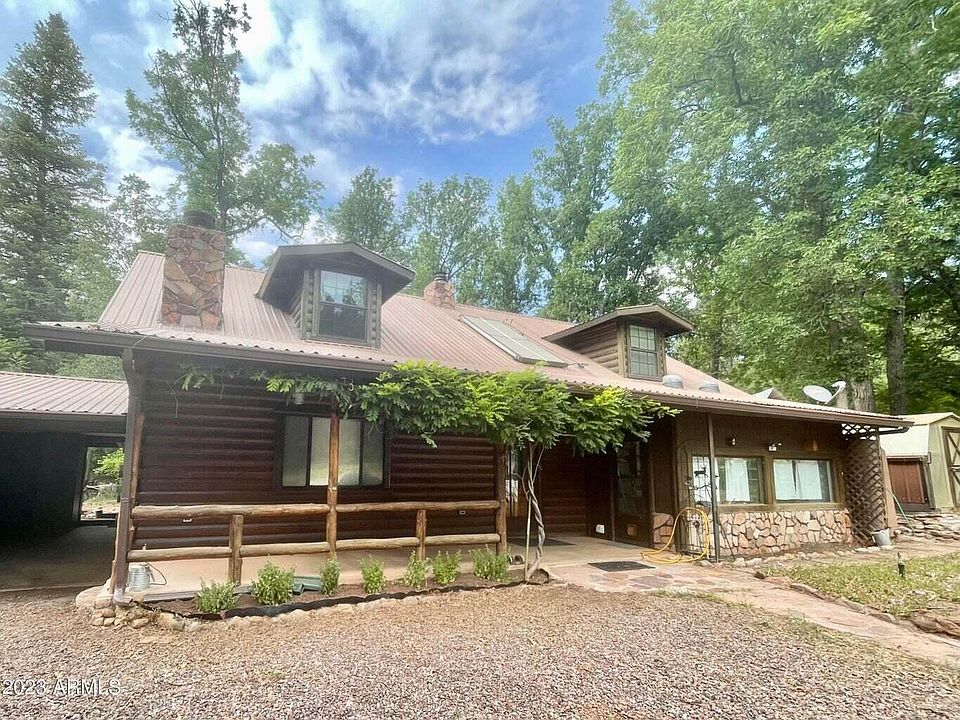 We call this place Glass Wagon Wheel, and it's a place unlike any other! A 4 bed 2 bath log cabin nestled beneath Mogollon Rim in beautiful Christopher Creek. Huge half acre lot with fruit trees and a bridge going over a seasonal creek right in your backyard. This green lush yard also comes with a toy garage, garden boxes, garden shed and covered RV parking. Outside you'll find two arbors on the property, a gated side yard, a huge shed just for storing wood, and a large compost rotating bin. Inside you'll find a sunroom, hidden meditation room behind a bookcase murphy door in the owner's suite, four bedrooms and large loft. Character everywhere! With a glass wagon wheel window, stained glass windows, and wood burning stove plus two gas..(more) fireplaces inside, this is a unique place you'll cherish forever. The oversized 2 car garage has lots of built in shelves, a bathroom and another wood burning stove, and a pull down ladder to access to massive attic space.