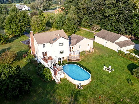 Welcome to this exquisite 3-bedroom, 2.5-bathroom colonial home, nestled on over 2.5 acres of land. This property offers the perfect blend of timeless elegance, modern comfort, and exceptional outdoor features, making it an ideal haven for families and entertainers alike. Step into a welcoming foyer that leads to a dining room which flows nicely into the living room adorned with large windows that flood the space with natural light. A cozy fireplace adds character and warmth to this inviting area. Upstairs, the primary suite is a true retreat with a closet and an ensuite bathroom featuring a luxurious soaking tub and separate shower. Two more well-appointed bedrooms offer ample space for family or guests, with a shared full bathroom. The finished basement space provides endless possibilities for a home theater, game room, or home office. The property truly shines in the great outdoors. Step outside to your private backyard oasis, complete with a pristine pool, a spacious patio for lounging and entertaining! Keep your vehicles secure and protected from the elements in the attached 2-car garage with convenient access to the home. Need more space for your hobbies or additional vehicles? The detached 2+car garage provides ample room for storage or a workshop. This Colonial home offers a harmonious combination of classic charm and modern amenities, with abundant indoor and outdoor spaces for your comfort and enjoyment. Don't miss the opportunity to make this house your forever home and create lasting memories with family and friends. Schedule a showing today and experience the lifestyle you've been dreaming of!