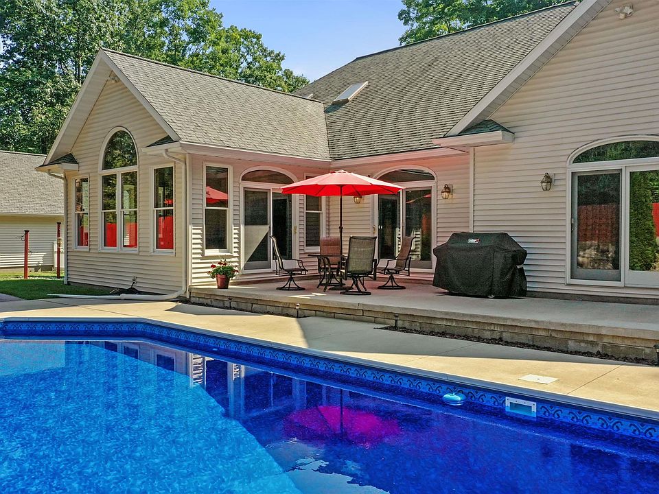 Welcome to 134 Frisco Dr., Houghton Lake! This stunning executive custom-built home is nestled in an upscale subdivision, offering the very best in luxury living. As you step inside, you'll be captivated by the spacious entry foyer that leads into the grandeur of the large, vaulted ceilings, creating an open and airy atmosphere throughout the home. The centerpiece of the living area is a magnificent four-sided gas log fireplace, perfect for cozy evenings and adding a touch of elegance to the space. The landscaped yard is truly a paradise, boasting an exquisite inground pool that invites you to relax and unwind on those warm summer days. The attention to detail continues in the custom kitchen, featuring beautiful granite countertops, ceramic floors, and custom KraftMaid cabinetry. The Jenn-Air gas cooktop with a built-in grill and griddle, along with the double oven, makes cooking a joy for any culinary enthusiast. The master suite is a true oasis, complete with a spacious walk-in shower, a luxurious jetted whirlpool tub, double sinks, a vanity, and a walk-in closet. Every aspect of this sanctuary has been thoughtfully designed to provide the utmost comfort and relaxation. For those seeking additional space, the basement offers a Rec room with a wet bar, perfect for entertaining friends and family. Additionally, there is a finished bonus room over the garage that can serve as a home office or the perfect set up for an entrepreneur providing versatility to suit your needs. Car enthusiasts will appreciate the attached three-car garage which is finished and heated, ensuring your vehicles are protected year-round. Furthermore, an additional garage known as the “Toy Box” is available to accommodate all your toys and storage needs. Enjoy the professional landscaping and concrete circle drive. Outdoor enthusiast this property is adjacent to State Land with access the trailhead from the backyard and a stunning in-ground pool oasis!