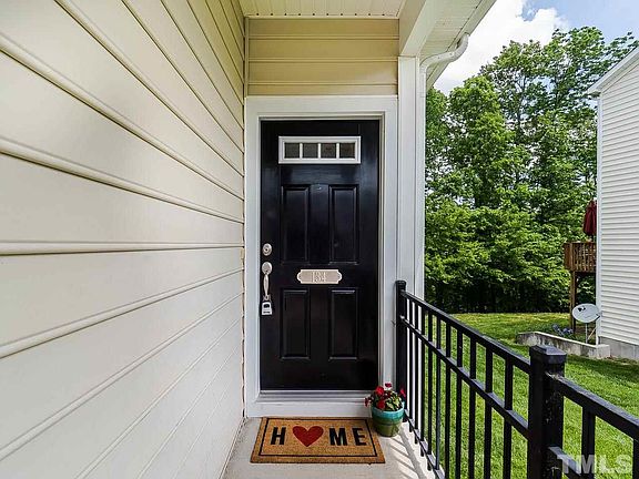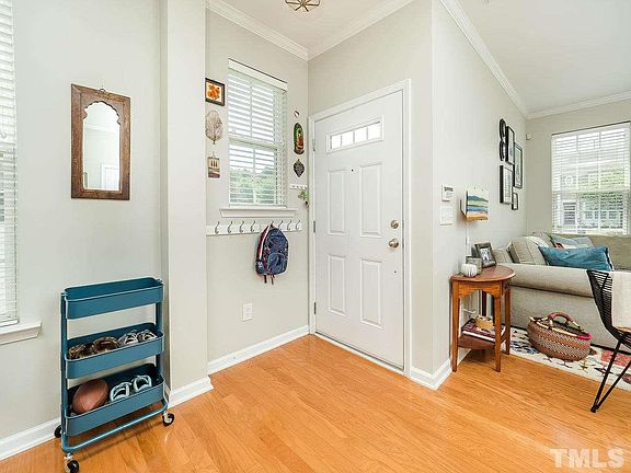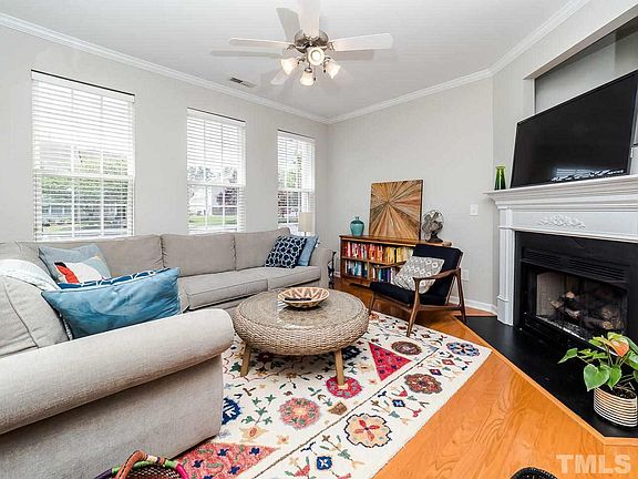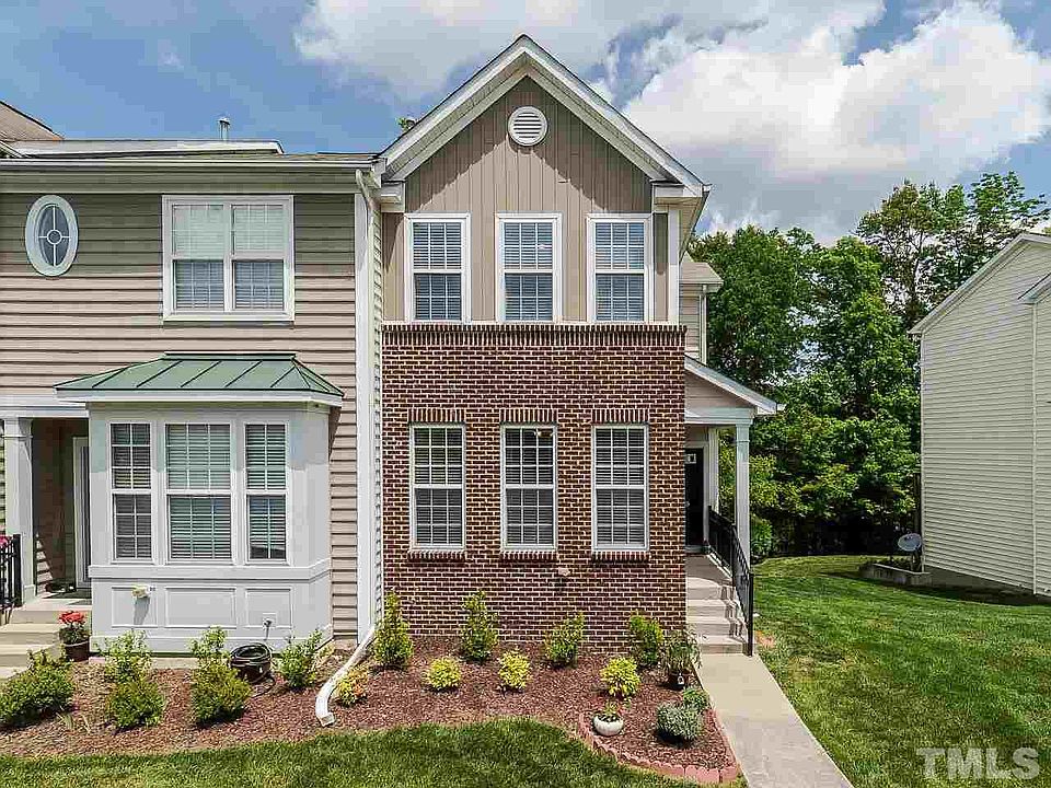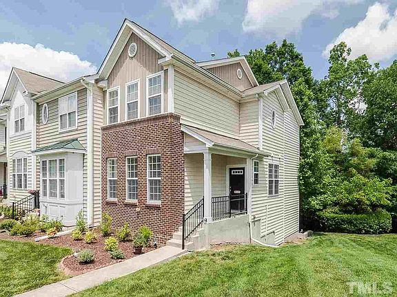 Light, bright, and airy, this end unit has it all! High ceilings, hardwoods, fresh paint and carpet upstairs, 2 fireplaces, windows galore! Two bedrooms on top floor with full baths en suite. Open middle floor has spacious kitchen, living, and dining areas. 3rd bedroom on bottom floor with full bath, sitting area, and access to patio. Huge storage room plus lots of closet space. Private back deck backs up to trees. Neighborhood trails and YMCA. Quick accessibility to all that Durham has to offer!