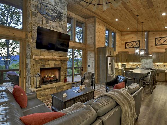 Luxury Mountain Modern unlike any other presently on market! Every room boasts tons of character & has layered mtn & valley views flowing in through the windows! This floor plan will amaze you...gourmet kitchen complimented by expansive kitchen island, great room complete w stone fireplace, comfortable living area & full, designated dining space, MBR en suite w spa-like MBA (full tile shower w linear drain & multiple jets), the main level deck extends the length of the cabin w an outdoor fireplace plus another fire pit area. Need a MIL suite or a place for your guests to have their own privacy? The main level features an attached totally separate 1br/1ba living space w it's own laundry, fireplace & full kitchen! The terrace level is an entertainer's dream...full wet bar w wine cooler & Jim Beam barrel sink! 2 br's & a full ba w an expanded, covered deck space featuring a 2nd outdoor fireplace, multiple seating & dining areas! Attached 2 car garage, professional landscaping w addt'l fire pit area & several garden spots. This is the property to maximize your rental portfolio! HAS FIBER INTERNET AND IS BEING SOLD FULLY FURNISHED!
