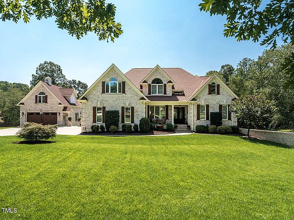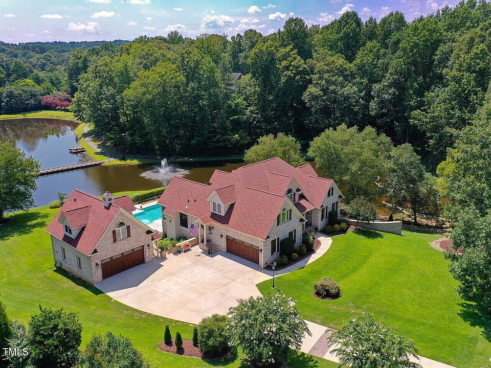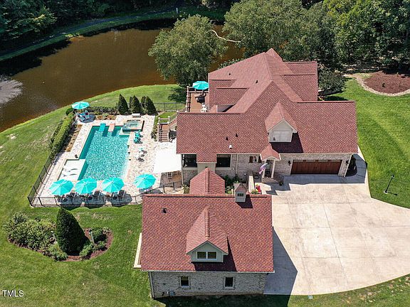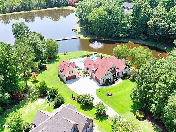 SLICE OF PARADISE! Indulge in the ultimate blend of luxury & pure enjoyment in this breathtaking waterfront estate on 3.5 acres, tucked inside a gated community at the end of a quiet cul-de-sac & long drive! With 4849sf of refined living, this all-brick, custom 4BDR/4.5BA home with a finished & unfinished basement, 20'x40' heated, saltwater pool & detached 2-car garage (with attic & basement) is designed for the life dreams are made of. Interior highlights include: Astounding attention to detail; Family Room with soaring vaulted ceilings & floor to ceiling stone fireplace; Elegant Dining; Chef's kitchen with island, side-opening Bosch double ovens, gas cooktop & adjacent breakfast area; Main-level Primary Retreat is true indulgence with a spa-inspired bath with lighted mirrors & walk-in Shower, bathroom pantry & massive designer closet with island | Upstairs offers 3 great BDRs, a Flex Room & tiered Home Theater for your streaming pleasure | Basement is an entertainer's paradise featuring a big Rec Room with fireplace, Huge wet bar has cabinetry, icemaker & mini-fridge, Full bath, Large Gym with French doors to Patio/Pool, Workshop & 2 Storage areas | Outdoors, every detail wows ~ Enjoy the views from the 3-Season Room with fireplace & expansive Trex deck both overlooking pool & lake; Relax by your private, oversized, gunite pool with caribbean blue water, sun shelf, integrated hot tub & tons of pool decking; Embrace lush gardens, private fountain in lake & fabulous underdeck relaxation space | The detached garage with partially finished attic (& bath) plus unfinished basement is perfect for car enthusiasts! So much more ~ Lush landscaping | Epoxy floors & cabinetry in Garages | Whole-house audio | Mahogany interior doors | 50-year roof | Newer mechanicals & more. Surrounded by trails, lakes & the Neuse River, this is one of Clayton's most extraordinary lots. Live, play, relax & enjoy ~ this dream home with acreage has it all!