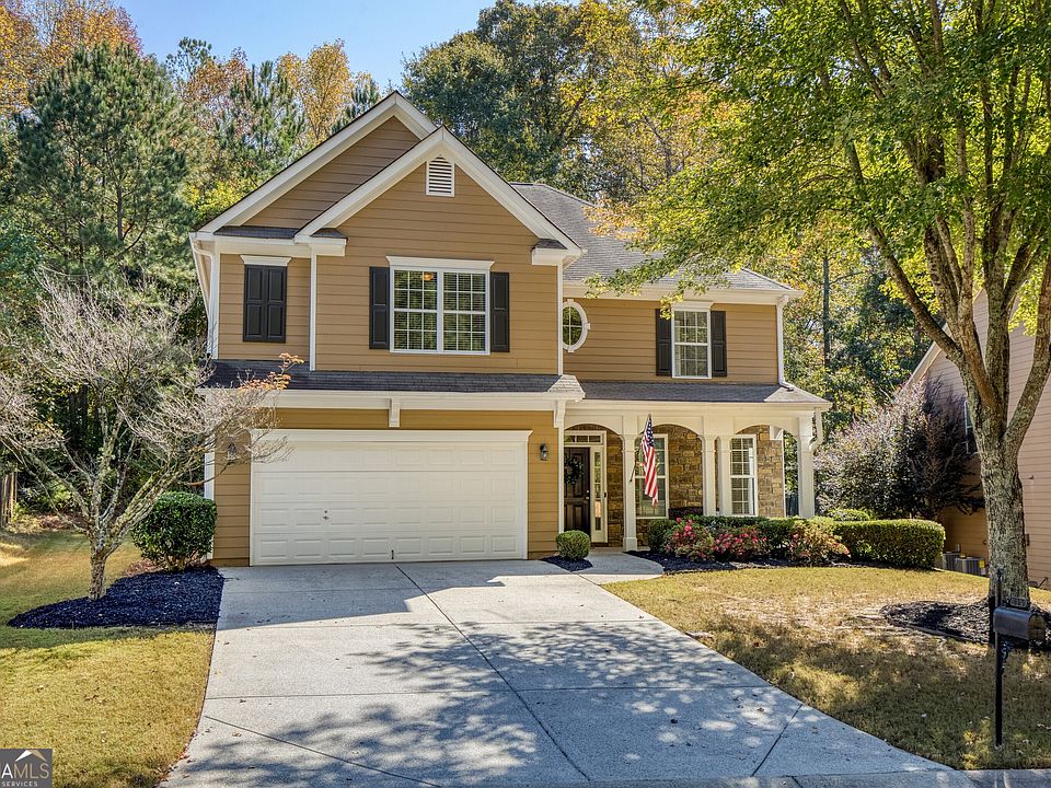 Welcome to this stunning two-story home in The Falls of Mill Creek, featuring a charming covered porch that invites you inside. The entryway and dining room showcase beautiful shaker wall paneling, adding character and elegance. Off the foyer, you'll find a versatile sitting room or flex space and a convenient half bathroom. The spacious kitchen is a chef's dream with abundant cabinet space, stainless steel appliances, gas range, and recessed lighting. A cozy breakfast nook offers lovely views of the backyard patio and private yard. The open-concept family room boasts custom shelves, a warm fireplace, and a striking wall of windows, making it the perfect spot to gather with family and friends. Upstairs, a flex space off the landing provides extra room for an office or play area. The oversized laundry room and large bonus bedroom with built-in cabinets offer flexibility and convenience. Two additional secondary bedrooms feature walk-in closets, providing plenty of storage. The master suite is a true retreat, with a tray ceiling and a luxurious ensuite bathroom complete with a soaking tub, separate shower, dual vanities, and an expansive walk-in closet. This home also features a hidden staircase for added charm and uniqueness. NEW carpet and interior paint throughout! Location, location, location! Great school district, close to shop and restaurants including Canton Marketplace and more! Don't miss the chance to make this beautiful home yours!
