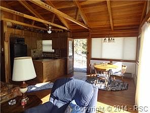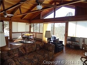 South-facing home with views of Pikes Peak; great room concept with kitchen/dining/living rooms; red wood tongue & groove ceilings and side walls; all kitchen appliances included; living room has wood burning Sierra stove insert and walks-out to newly built large deck; newer Renai gas heater in living room; lower level has finished family room that walks-out to 2.13 Ac; workshop room; home restained in 2020,cul-de-sac privacy; treed; circular driveway; Community water system; natural gas and electric baseboard heat.