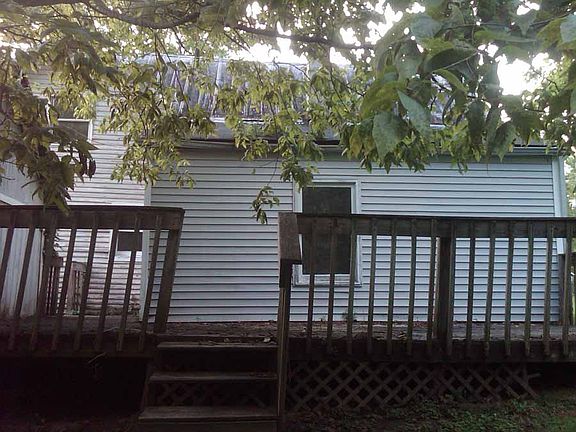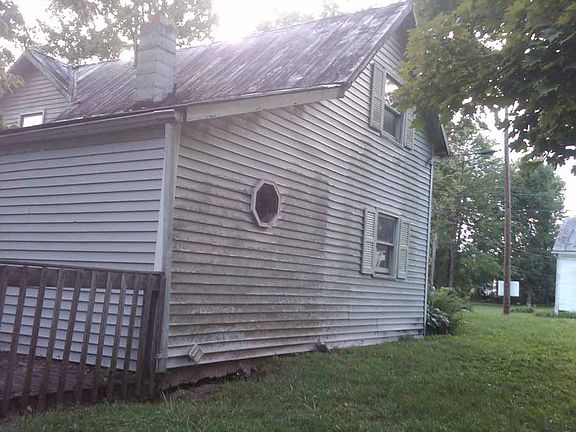 Exterior Features:A 2 story farm house with vinyl siding that is in good condition and a metal roof that is in poor condition. The flat roof above the front porch is in poor condition with damaged facia. There is a dettached garage with a stone driveway. There is also a storage shed at the rear of the property. The house has a large wood back deck.Interior Features:The overall condition of the house is poor. The kitchen is fully intact with vinyl tiles on the floor. The bathroom is fully intact. The living room and bedrooms have carpet that is in poor condition. There are holes in the walls and some areas with mold. The furnace and the hotwater heater are still intact.
