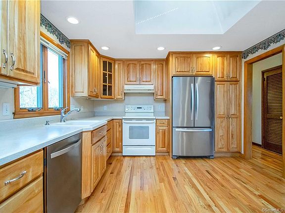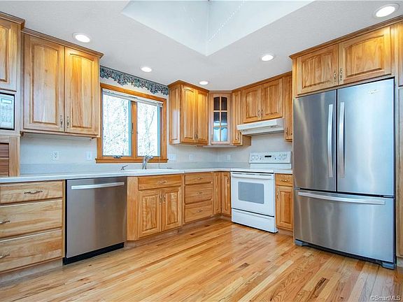 Meticulously maintained home located on over 4 acres of land for privacy and recreation! Beautiful updated kitchen with red birch solid wood cabinets, wood floors, pocket doors and some new stainless appliances. Oversized living room with bay window is open to the dining room. Freshly refinished hardwood floors throughout the main level! Full bathroom has been remodeled with double sinks, synmar countertop, new tub and heat lamp. Master bedroom opens to the full bath and has 2 closets. Lower level has a large rec room with a wood burning fireplace and leads to an outdoor patio. Over sized Deck on main level is perfect for entertaining and enjoying the woodland views! Vinyl siding, anderson windows, new front door and sliders, new furnace, new well pump, new driveway. The large garage has built-in shelves and is heated! Built 1969 and maintained throughout the years by the original owner. 3 lots will convey together to total 4.02 acres. Price reflects a repair that may or may not be needed to garage frost walls that were replaced in 1990. Engineer report and estimate can be provided.