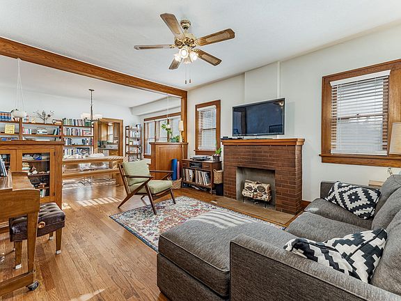 This craftsman bungalow is filled with character! During its lifetime, it has been owned by only 3 families, and you could be next! The charm starts the minute you walk in with the gas log fireplace, hardwood floors, the living room and formal dining room being separated by beautiful wooden built-ins, including a built-in drop-leaf desk. The kitchen includes a cozy eating nook and plenty of cabinet space. The bathroom has been updated along with both upstairs bedrooms having new carpet and fresh paint. There are washer & dryer hookups on the main floor and also in the basement. The home is well-insulated, well maintained, and has a 5 year old roof. Plenty of additional storage is available in the unfinished basement or the detached 2 car garage. The backyard is enclosed with a chain link fence and the trampoline comes with the house! This College Hill-adjacent home is a half block away from the popular Douglas Design District and is close to East High, Blessed Sacrament Catholic School, Wichita Technical College, highway access via Kellogg or I-35, and popular downtown restaurants and venues.