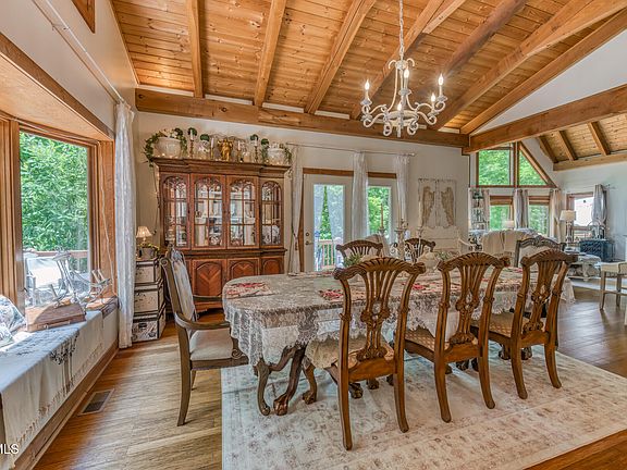 A Blue Ridge Mountain paradise on 32+ private acres! Soaring vaulted ceilings with exposed beams, a dramatic wall of windows overlooking peaceful woods, a main-level king suite with jetted tub, multiple decks for unforgettable wildlife watching, and a stream with a private bridge leading to hiking trails and long-range views of Grandfather Mountain — this retreat is truly one of a kind. Rustic charm meets modern comfort, creating the ultimate blend of serenity, adventure, and opportunity. And here's the kicker — the property directly behind you borders North Carolina, making this the dream mountain retreat you've been waiting for!