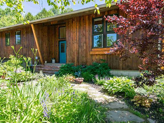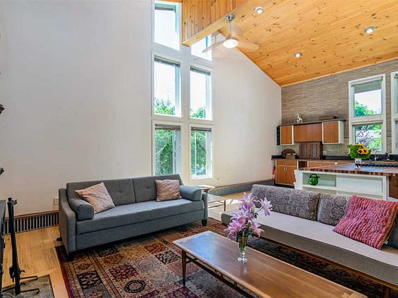 Striking Contemporary Shelburne home with mid-century modern flair! You will fall in love with the open floor plan, vaulted ceilings, ample natural light, and unique architectural details. Living room features a stunning stone fireplace with Panton, VT stone (3 openings throughout home), floor-to-ceiling windows, and slider to sunroom. Opens to upgraded kitchen with newer stainless steel appliances, a custom butcher block island, teak veneer, grass cloth wall detail, 1850s chalkboard counter tops, and cork flooring. Spacious master suite includes a sitting nook, double closets, vaulted ceiling, large windows, and shared master bath with soaking tub, separate shower, and double vanity. Sunroom opens to screened back deck and back patio. Generous and private backyard has room for abundant gardens. Many upgrades include freshly sanded hardwood floor, newer drainage system, and large windows for passive solar (installed 2015). Freshly painted and ready to go!