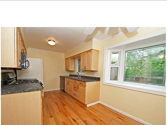 Ranch home surrounded by nature at the end of a quiet and secluded street. Updated kitchen with oak cabinets, nice counter space and all appliances included. Beautiful bay window in dining area. Ceiling fans in all bedrooms and dining room. Updated upstairs bath. Large finished basement with wood burner. Enclosed sun room under main floor deck. Deck is half open, half screened in something for everyone.