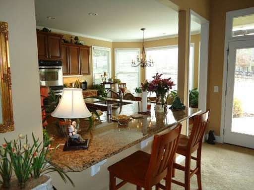 - Kitchen Features: Breakfast Bar, Cabinets Stain, Eat-in Kitchen, Stone Counters, View to Family Room