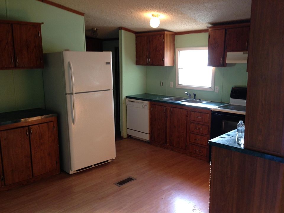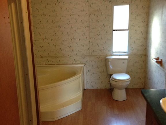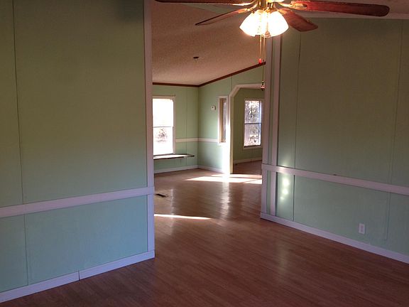 Doublewide mobile home on 9 acres with trees. It has open floor plan, 2 living areas, fireplace, and large kitchen. The master bathroom is large with garden tub. It has fresh paint and partial fenced area