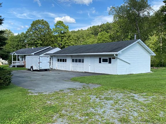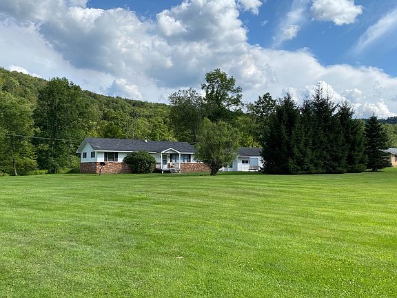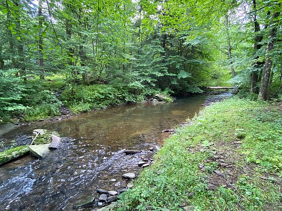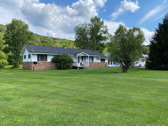 Attractive 2 bedroom ranch house comes with 14.5 acres and a rushing trout stream! Also includes a 3 car garage attached by an enclosed breezeway. Garage is complete with wood stove and electric. Never brush snow off of your car again! The beautiful year-round trout stream flows privately through the 14 acre parcel; perfect for a cool dip on a hot summers day. Giant front yard is perfect for games and family gatherings and the long driveway keeps you private from the road.