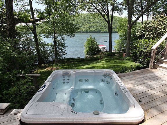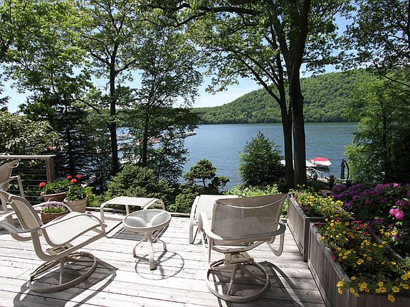 Enjoy Candlewood Lake comfort and the quintessential getaway in this updated, open concept, Western exposure home. Lake views abound from just about every luxurious room. The large chef's kitchen complete with granite countertops & professional grade stainless steel appliances flows freely into the dining room, as well as spacious living room, featuring a Fieldstone fireplace, floor-to-ceiling windows, and vaulted ceilings. A full, house-length deck with hottub, and plenty of space to entertain leads to the lake. A short hallway ushers you into the private main level master suite whose spotlights include Western sunset views and a walk-in closet. A two car garage, mudroom, & a three season enclosed porch are also found on the main level. The second level features two oversized bedrooms, each with walk-in closets, vaulted ceilings, and full bathrooms. One of the bedrooms walks out onto a private and spacious rooftop deck, the perfect place to enjoy the evening or morning coffee. The waterfront boasts a large dock, lakeside patio, well-landscaped yard, steps to sandy area, & of course, wide lake views with magnificent sunsets. This one-of-a-kind home also comes with a separate and private finished space that contains two individual offices sharing a double-sided fireplace. Countless other modern amenities include an updated propane furnace, Nest temperature control, & custom outdoor lighting. Come experience lake living year-round in this exquisite waterfront retreat.