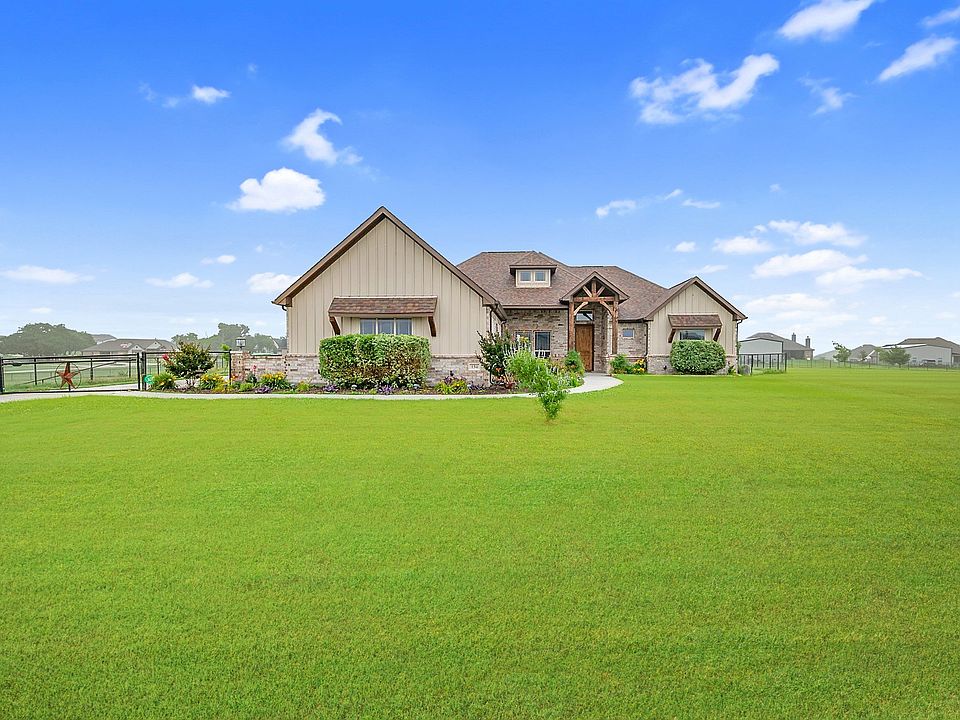 STUNNING Ashlyn Custom Home located in the desirable community of Stanford Estates! Like new home with a FULLY FENCED YARD AND NO HOA! No space is wasted with this functional and open floor plan. Interior features include 3 spacious bedrooms all with walk in closets and custom shelving, an office space with French doors that could easily be used as a 4th bedroom, wood look tile flooring throughout, impressive wood beams, granite countertops, crown molding, split bedroom floor plan, drop zone off of the laundry room & a gas fireplace! This chef’s kitchen includes custom cabinetry, pull out spice racks, a walk in pantry & a Texas sized kitchen island! Inside the master suite you will find custom wood work details, a sitting area in the master bathroom, dual sinks & shower heads, a walk through shower & a spacious walk in closet! Enjoy your morning coffee on this enclosed back patio complete with wood burning fireplace. Additional exterior features include ample driveway space for your boat or RV, 3 car garage, solar powered electric gate, sprinkler system, rain gutters, exterior lighting & a 1 acre lot. Septic was pumped in February 2024. Fiber Internet available through Nextlink or Frontier.