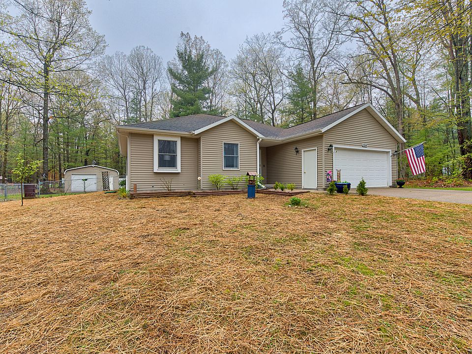 Built in 2001, this well-maintained home is nestled in a peaceful neighborhood and sits on two spacious lots, offering both privacy and room to grow. Inside, vaulted ceilings enhance the open floor plan, creating a bright and airy atmosphere that flows effortlessly through the main living areas. The beautifully landscaped yard and fully fenced backyard provide the perfect outdoor retreat, while a sunroom invites relaxation year-round. The generous master suite offers a private haven with ample space and comfort. Whether you're seeking a serene vacation getaway or a comfortable full-time residence, this property delivers. Plus, with a DNR boat launch just six minutes away, enjoying the lake is always within easy reach. Don't miss this rare opportunity to enjoy space, serenity, and convenient access to nature...all in one place.