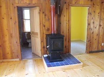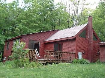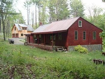 This attractive home offers a sunny open concept kitchen dining area with full appliances, wood burning stove, skylights and wide pine floors. In addition to the sunken living room with cathedral ceilings is a large loft for storage or play area. The house is complete with large back deck and cozy covered front porch. The property also has a wood shed and two car garage with 17x19 over head studio room located on 5+/- acres. This great property is a perfect first home or vacation getaway.