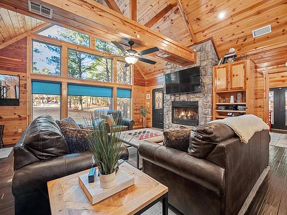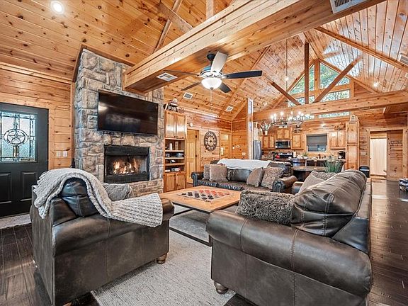 Experience this terrific traditional 4-bedroom, 3.5-bath cabin with a beautiful copper roof. Lot 1 has a total of 2.07 acres. This lot has been split to offer the advantage of building another STR cabin on it!! The surveyed split allows 0.58 acres to be used for another cabin build. The current cabin sits on 1.49 acres that exudes a cozy, rustic charm with a beautiful stone fireplace in the living room and a stunning wall of windows that bring the outdoors in. The open floor plan creates a welcoming flow, and the kitchen is equipped with sleek stainless steel appliances. There's ample dining space, including an island with seating for 4 and a dining table for 6. Sleeping 8 guests comfortably, the cabin also features a convenient half bath. There's plenty of room to explore, horseshoe pit for outdoor fun, plus a playset for the kiddos. Guests can relax around the firepit in Adirondack chairs or unwind on the spacious covered deck, which also features a brand-new hot tub. Perfect for families and groups this cabin makes a great STR with a perfect location. Fishing Bear is nestled in the heart of Hochatown, just minutes from popular spots like Grateful Head Pizza and Girls Gone Wine.