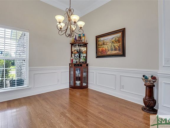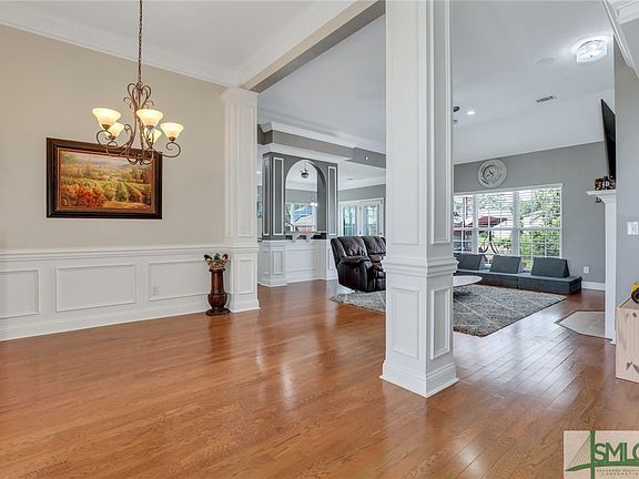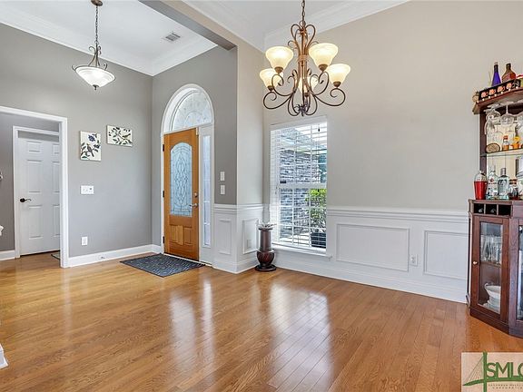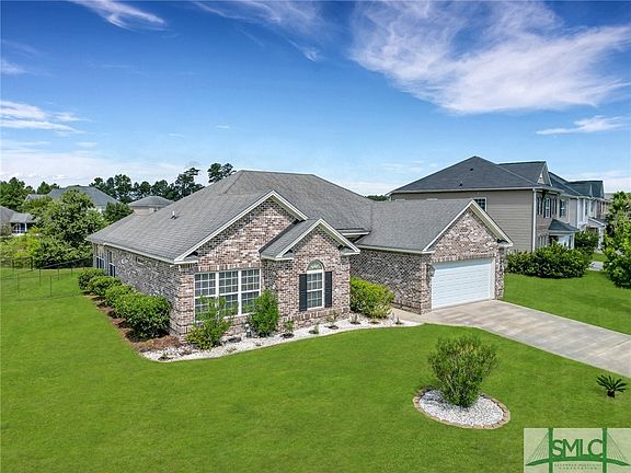 Spacious all brick, one-level home on .27 acre with split floorplan overlooking a shimmering lagoon. Upgraded mouldings, gas fireplace and high ceilings in great & dining rooms will WOW you! Living areas have hardwood flooring throughout. Kitchen has white cabinets, granite counters, stainless appliances, breakfast bar & breakfast area. Custom built-ins next to the kitchen add storage and additional seating. New 4-Season porch built for additional space has built-in seating/storage & plank flooring. Spacious primary bedroom has luxury plank flooring, a lighted tray ceiling and huge 11 x 8 walk-in closet. French doors open onto the tiled primary bath featuring a jetted tub, separate shower & dual vanities. Two additional bedrooms have vaulted ceilings and a tiled 2nd bath is located between them. The rear yard is fully fenced with wide gates. Entertain on the back patio and large circular brick patio area. Easy commute to I-95/I-16, Airport, Gulfstream, shopping and restaurants.