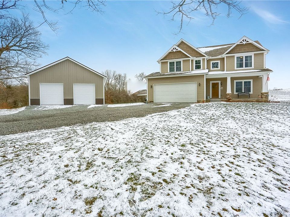 Tucked away on nearly 5 Instagram-worthy acres is where you will find this Schumacher built Arts & Crafts inspired farmhouse. This one packs curb appeal with Shake Gables, a Craftsman Trim Package and Stone Veneer accents which invite you to the large covered front porch with classic pillars. Upon entry, you are greeted by the bright 2 story foyer. The formal living room is off the entry and flows into the family room. The family room opens to the dining area and chef's kitchen. The kitchen offers ample cabinet and counter space. For added convenience: first floor powder room and laundry room. The 2nd story has an open loft that's ideal for a home office. The spacious owner's suite has an enormous walk-in closet and en-suite. Two roomy bedrooms with 2nd full bath completes this level. 21x23 attached garage, 30x30 detached garage, Low E Energy Efficient Windows, Poured Foundation, OSB Sheathing, High/Low Returns on 2nd floor, New concrete patio, walkway and detached garage pad.