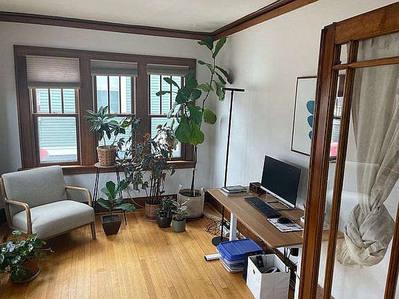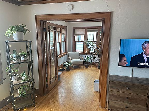 Unit incudes Main Floor and Finished Basement with bath. 2nd floor is a separate apartment . Main floor is 1500sq/ft with hard wood floors, 2 bedrooms and lots of windows. Kitchen has stainless steel Refrigerator, Stove, Dishwasher and Microwave. Full dining room, family room and solarium. Finished basement including bathroom is 1200 sq/ft. Basement has 2 bedrooms, and large living room. Central heating and cooling. Unit includes full size washer and dryer in basement. Small shared patio in the back. Small fenced back yard with a large tree. Renter is responsible for electricity, gas, internet. Water and trash is included in the rent. 2 parking spots in the back. Garage is not available. Small to medium animals are welcome. Unit comes with two parking spots behind the house. This is a non smoking unit.