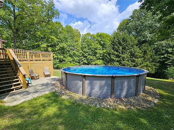 This great home offers one level living w/ main floor entry & convenient attached garage. You'll love the gorgeous 1 acre setting backed by woods on a beautiful tree lined road. Enjoy sitting on the back deck, relaxing in the pool or enjoying an evening camp fire in the secluded lower yard. The open floor plan is a great feature. The kitchen offers ample cabinets for storage, pantry, eat-in area & includes the appliances. The kitchen offers a view of the living room & opens to the dining room. A stone, log burning fireplace separates the dining room from the spacious living room w/ cathedral ceiling & skylights offering natural light. Sliders lead to the deck for grilling/dining. The spacious master bedroom features a walk-in closet & en suite bathroom. 2 additional bedrooms & a 2nd full bath are offered down a separate hall. The lower level offers a walk out to the back yard, laundry, storage room & is ready for you to finish a den & game room. The extra wood/coal furnace is a plus.