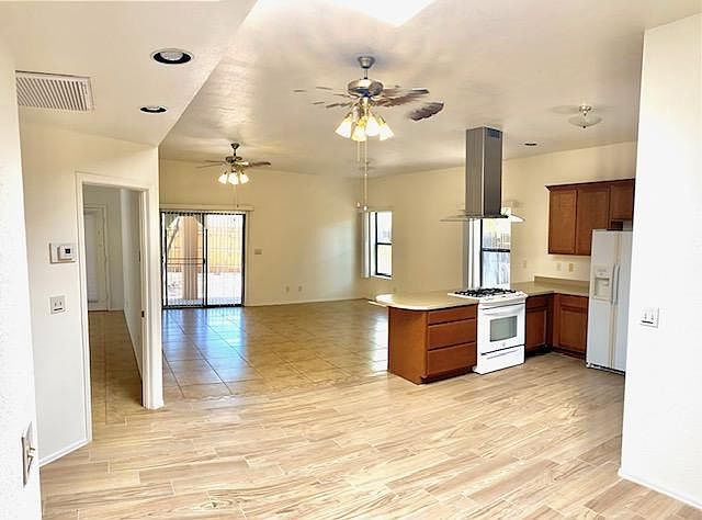 Available April 1. Private, off street location. No-Smoking/Vaping property, 3 bedrooms, 2 full baths in north central neighborhood near Prince & Mountain, 2 miles north of University of Arizona. Built in 1997, a modern floor plan offers 1600 sq ft of living space. Ceramic tile floors through out. Central AC and heating. Recently remodeled kitchen offers gas stove, ceiling mount stainless vented hood, dishwasher, garbage disposal, gas stove and new side-by-side stainless steel refrigerator (not pictured). New modern ceramic tile. High ceilings with 5 ceiling fans and large sky light in kitchen/dining entry and both bathrooms for extra light. Master bedroom has 2 large windows and separate glass door to back porch and yard. Nice walk-in closet with a 2nd closet adjacent to master bedroom. 2nd bedroom is large with 2 windows and a 3-sliding door closet. Above large closet is a loft storage area. 3rd bedroom is perfect for office or TV den. Glass slider doors give access to a covered back porch and large private yard. Double covered carport has extra storage room and washer/dryer hook-ups in enclosed laundry room. Shaded backyard has low-care mature trees with an automated irrigation system for all the plants around home. Plenty of room (and sun) for a garden too. This property and home next door, owned by the same landlord, share a private driveway. Gate at driveway entrance could be kept closed to increase security. Sorry, no dogs (exception: ADA Service Dogs with proper certification). Bike to the UofA on Mountain Ave bike path and close access to Rillito River Bike Path (The Loop). Close to shopping and great restaurants on Campbell Ave. Do not disturb residents. 12 month lease. No smoking/vaping inside or out. All utilities in tenant name. No application fee, however, applicants will be screened for credit, evictions, criminal history. This property is family owned and managed. To receive our application, prospective tenants must meet the following: 1. This unit is non-smoking/vaping, no dogs. 2. Net income of $5500/mo. 3. No evictions or collections. 4. Verifiable rental history. 5. One year lease. If you qualify, we'll email you our application. Zillow's ap is an initial option. Thank you!